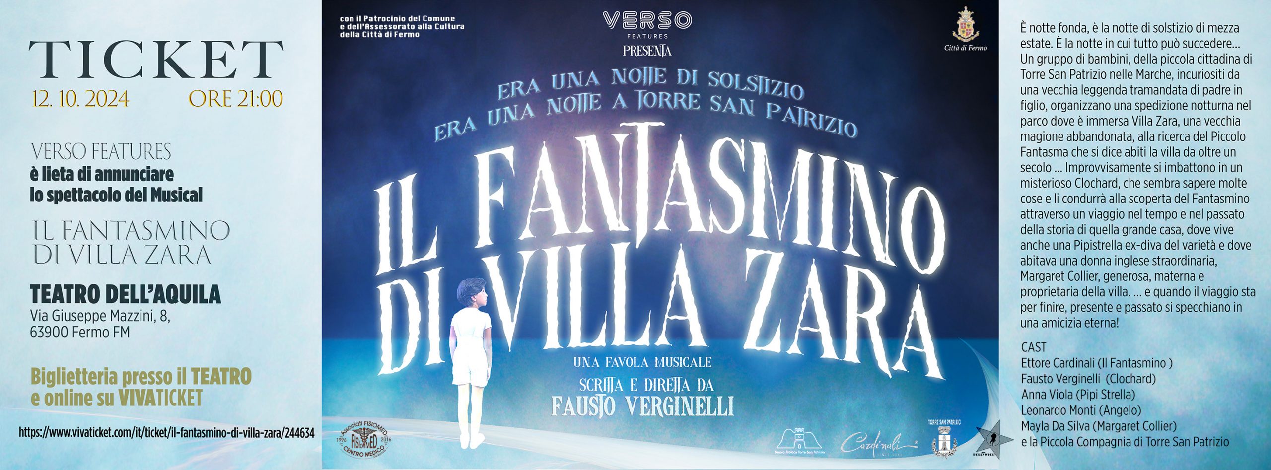 THE STORY: “The Ghost of Villa Zara” is a musical that falls into the genre of “ghost stories” much told in children's literature and especially famous in English culture. In fact, the work brings to the theater the charm and attraction that has always exercised on children and adults, the imagery of the "haunted house" or "ghost house". It is a theatrical show, which is a real musical, which has its roots in regional narratives and traditions, as the work is inspired by Margaret Collier's novel "A House on the Adriatic" and the popular legend around the little ghost of Villa Zara. The narrative structure tries to transfer into the fantastic story a series of food for thought on the value of family unity and welcoming others, while favoring the adventurous character. The opera features 13 children between 7 and 12 years old, from the town of Torre San Patrizio, who, after an intensive preparation workshop lasting from mid-July to the end of August 2023, will act, sing and dance like professionals in a musical work very engaging, lasting an hour and a half, which celebrates not only the places and local culture, but also the artistic talent of the very young performers. The show is sung and played live, with accompaniment by local musicians.